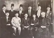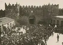 O nacionalismo árabe (em árabe: القومية العربية, translit. al-qawmīya al-ʿarabīya) é uma ideologia política que afirma que os árabes constituem uma única nação.[75] Embora o nacionalismo árabe, pelo menos numa forma inicial, e o nacionalismo sírio fossem as tendências dominantes, juntamente com a lealdade contínua ao Estado otomano, a política palestina foi marcada por uma reação à predominância estrangeira e ao crescimento da imigração estrangeira, particularmente sionista.[76]