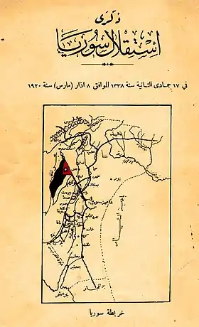 - O primeiro de uma série de Congressos Árabes Palestinos que ocorreram de 1919 a 1928. Sob a presidência de Aref al-Dajani, ex-prefeito de Jerusalém, resolveu rejeitar o sionismo, a Declaração Balfour e o envolvimento estrangeiro no Oriente Médio, e chamou para a Palestina fazer parte de uma Grande Síria independente sob a autoridade de Faisal, filho de Hussein, Sharif de Meca.[15]