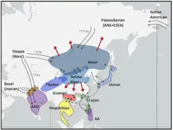 Os habitantes modernos do Nordeste da Ásia consistem sobretudo na ancestralidade Amur, que se expandiu maciçamente com o cultivo de painço. Os modernos habitantes do Sudeste Asiático, especificamente os das Filipinas, Península Malaia e Arquipélago de Sunda, consistem sobretudo na ancestralidade fujiana, que está associada à disseminação do cultivo de arroz. Os asiáticos orientais contemporâneos, sobretudo falantes de línguas sino-tibetanas, consistem sobretudo da ancestralidade do Rio Amarelo, associada ao cultivo de painço e arroz. Os tibetanos consistem tanto na ascendência tibetana antiga quanto na ascendência do rio Amarelo. Descobriu-se que os japoneses modernos têm uma origem tripartida: consistindo em ascendência Jōmon, Amur e do Rio Amarelo. Os povos indígenas da América se formaram a partir dos Antigos Eurasiáticos do Norte (um povo relacionado aos europeus e médio-orientais) e de um antigo ramo do Leste Asiático, dando origem aos "berinigianos ancestrais", ancestrais diretos dos paleossiberianos e ameríndios. Caçadores-coletores negritos isolados na Península da Indochina, como os semang da Malásia, são descendentes em grande parte dos hoabinhianos.[3][12][13][14][15][16][17][18][19]