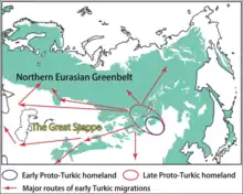 As propostas para a região de origem dos povos túrquicos e sua língua são muito diversas, indo desde a Ásia Central até a região da Manchúria.[90]