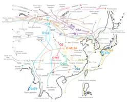 A distribuição do Haplogrupo D-M174 do cromossomo Y é encontrada entre quase todas as populações da Ásia Central e Nordeste da Ásia ao sul da fronteira com a Rússia, embora geralmente com uma frequência baixa, nunca maior que 2%. Um pico dramático na frequência de D-M174 acontece conforme se aproxima do Planalto do Tibete. D-M174 também é encontrado em altas frequências entre os japoneses, mas diminui em baixas frequências na Península Coreana e na China. A alegação de que navajos e tibetanos estão relacionados, embora discutida entre linguistas desde Edward Sapir, não encontrou suporte em estudos genéticos. Houve algum esclarecimento sobre suas origens, no entanto, por um estudo genético, no qual foi indicado que os cromossomos Y tibetanos tinham origens múltiplas, uma da Ásia Central e outra da Ásia Oriental.[89]
