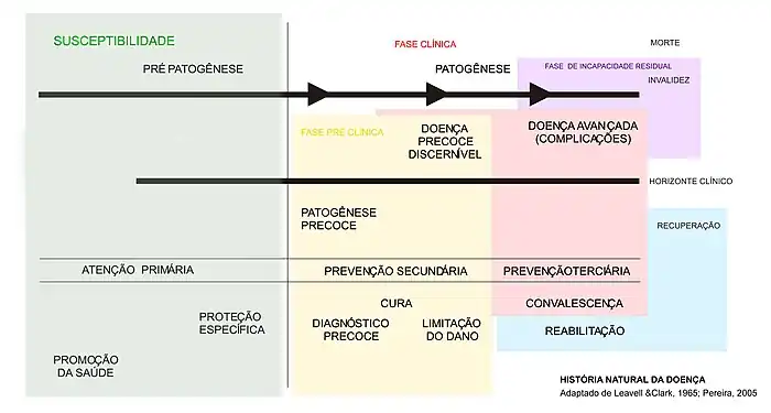 Para muitos autores incluindo Leavell & Clark é possível identificar distintos momentos da “história natural das doenças” orientando-se pela vertente epidemiológica desse conceito, ou seja, não se limitando às considerações fisiopatológicas ou anatamo-clínicas da descrição das patologias. Do ponto de vista epidemiológico pode-se distinguir 4 fases de evolução, associados por sua vez à distintos níveis de prevenção por ações de saúde:
