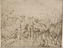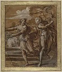 No gabinete de desenhos e gravuras do Louvre há um desenho evidentemente ligado a este afresco. Para alguns autores trata-se de um estudo preparatório, que é devido a Annibale, enquanto outros consideram que é uma cópia do desenho inicial que se perdeu.[14][3]
