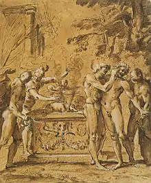 Em relação a este afresco da lareira, conhecem-se dois desenhos, ambos atribuidos a Annibale, estando um no Gabinete de Desenho e Estampas do Louvre e o outro no Museu Britânico. Este último, representando a composição geral, foi usado no afresco embora com variantes, apenas para a parte onde está representado o sacrifício no altar, enquanto o grupo do primeiro plano foi completamente alterado e corresponde ao desenho do Louvre.[33]