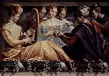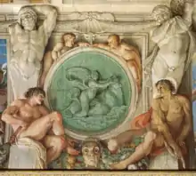 A tudo isto acresce uma série de invenções decorativas que dão um novo significado ao jogo de observações entre ilusão e realidade, que se nota num dos principais exemplos da pintura barroca nascente. Invenções como os putti que brincam com o observador, ou as "loucas" máscaras que procuram olhar os afrescos que enquadram, num jogo entre vários níveis de ficção, no diálogo entre cenas narrativas e elementos decorativos do friso. Grande parte disto será replicado nos afrescos do Palazzo Farnese (Roma), obra-prima de Annibale Carracci e o ato fundador do barroco romano.[45]