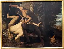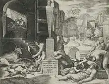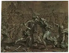 A composição tem sido considerada próxima duma famosa gravura de Marcantonio Raimondi, baseada numa invenção de Raffaello, que descreve o Massacre dos Inocentes, do qual foi derivado o esquema compositivo geral.
