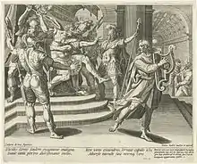 Para este afresco foi proposto como fonte inspiradora da composição uma gravura de Jan Sadeler I extraída de uma obra de Marteen de Vos retratando o episódio bíblico em que David que aplaca a ira do rei Saul tocando uma cítara.[17]