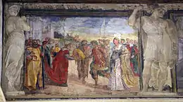 O último afresco do friso do Palazzo Magnani é em geral atribuído a Agostino Carracci.[37]