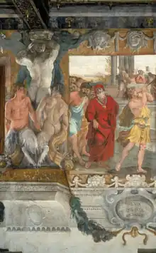 O afresco mostra uma semelhança significativa com uma gravura desenhada a partir de um desenho de Marten de Vos que representa a Persecutio Servientium Christo e que foi provavelmente um modelo para este afresco Magnani.[17][18]