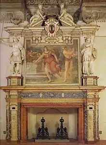 A ornamentação da lareira é notável, com as estátuas em gesso de Marte e Minerva, devidas ao referido Fiorini, que também colaborou com os Carracci noutras ocasiões. As duas estátuas devem ser entendidas como personificações de Roma e Bolonha. É óbvia a associação de Roma a Marte, devido a este ser tido como pai de Rómulo e Remo, enquanto a identificação entre Minerva e Bolonha deriva de um emblema de Achille Bocchi (Symbolicarum quaestionum de universo genere quas serio ludebat libri quinque, CXV), onde, precisamente, a cidade é representada como Minerva.[39]