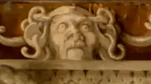 À direita, há um putto feminino, o único do friso, que segura uma das pontas do festão de frutas e de flores que se estende ao longo de todo o friso.[37]