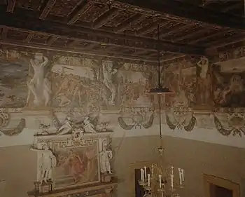 Quanto à datação dos afrescos, um termo "ante quem" é fornecido pela data MDXCII (1592) que aparece na chaminé do salão, data que se considera como o momento de conclusão de toda a decoração, incluindo um teto valioso de madeira e a própria notável lareira monumental. É muito provável que o friso tenha sido concluído algum tempo antes.[11]