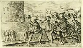 A gravura tem na base a frase em latim que descrevia o afresco: «ECCE TRHAVNT MANIBUS VINCTVM POST TERGA SINONEM» ("Aqui, eles arrastam Sinone com as mãos amarradas nas costas").