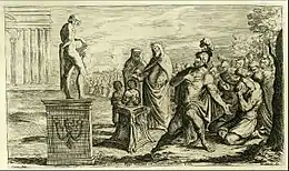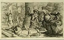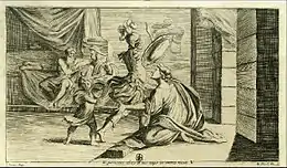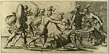 A gravura repete a frase em latim que descrevia o afresco cuja cartela se perdeu devido a uma queda de gesso, sendo conhecido graças à transcrição feita por Malvasia na sua obra Felsina pittrice: «CRINIBVS E TEMPLO TRAHITVR PRIAMEIA VIRGO» ("A filha virgem de Príamo é arrastada para fora do templo pelos cabelos").