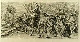 Podemos ver Eneias seguir o sentido indicado pela esposa, abandonando a cidade pela segunda e última vez, enquanto o massacre continua.