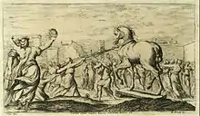 A primeira gravura representa o evento culminante do engano pelo qual os gregos conquistam Troia, após anos de luta inútil. Os Gregos fingem abandonar o acampamento, mas deixam para trás um imenso cavalo de madeira. Os troianos questionam a natureza desse objecto insólito e um deles, Laocoonte, adverte sobre o perigo que dele advém: "Timeo Danaos et dona ferentes" ("Temo os gregos mesmo quando trazem presentes").