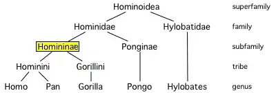 Até 1980, a família Hominidae era considerada integrada somente pelos humanos e seus antepassados imediatos, quando que os símios antropomorfos eram classificados na família Pongidae.[1] Os descobrimentos da paleogenética impuseram a revisão da classificação, e a inclusão dos grandes símios e os humanos juntos na família Hominidae[2], a qual se divide em duas subfamílias: Ponginae (os orangotangos), e Homininae, que se separaram há 11 milhões de anos.[3] A taxonomia do Hominóides tem sofrido diversas alterações na classificação dos primatas nos anos recentes.