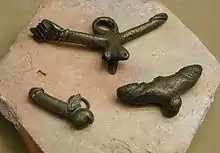 Ao mesmo tempo, o falo foi exibido onipresente na forma do fascinum, um feitiço mágico pensado para afastar forças malévolas; tornou-se uma decoração habitual, amplamente encontrada nas ruínas de Pompéia, especialmente na forma de espanta-espíritos (tintinnabula).[67] O falo descomunal do deus Príapo pode originalmente ter servido a um propósito apotropaico, mas na arte é frequentemente visto como provocador de riso ou grotesco.[68] A helenização, no entanto, influenciou a representação da nudez masculina na arte romana, levando a uma significação mais complexa do corpo masculino mostrado nu, parcialmente nu ou vestido com uma armadura muscular.[69]