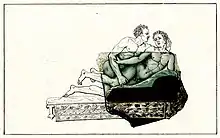 O sexo a três na arte romana normalmente mostram dois homens penetrando em uma mulher, mas uma das cenas suburbanas mostra um homem entrando em uma mulher por trás enquanto ele, por sua vez, recebe sexo anal de um homem parado atrás dele. Este cenário é descrito também por Catulo, Carmen 56, que o considera engraçado.[62] O homem no centro pode ser um cinaedus, um homem que gostava de receber sexo anal, mas que também era considerado sedutor para as mulheres.[63] O sexo grupal também aparecem na arte romana, normalmente com dois homens e duas mulheres, às vezes em pares do mesmo sexo.[64]