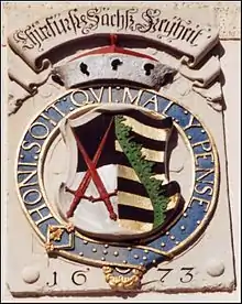 O Rei grita então (em francês, que era a língua oficial da corte inglesa) "Messieurs, honni soit qui mal y pense! Ceux qui rient en ce moment seront un jour très honorés d'en porter une semblable, car ce ruban sera mis en tel honneur que les railleurs eux-mêmes le rechercheront avec empressement." (Maldito seja quem pense mal disto! Os que riem nesta hora ficarão um dia honradíssimos por usar uma igual, porque esta liga será posta em tal destaque que mesmo os trocistas a procurarão com avidez).
