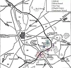 Durante a Segunda Batalha de Ypres (22 de abril - 25 de maio de 1915), Hooge foi novamente o local de intensos combates, incluindo a Batalha de Bellewaarde que foi travada naquela área de 24 a 25 de maio de 1915. No final de julho, os alemães novamente assumiram o controle da área.[4] Em 30 de julho de 1915, Hooge foi o local do primeiro uso de lança-chamas ("fogo líquido" como era referido na época), empregados pelos alemães contra as posições britânicas.[5] Hooge foi retomado pelos britânicos em 9 de agosto de 1915,[6] reclamado pelos alemães em 16 de junho de 1916 (para desenvolvimentos estratégicos nesta área durante junho de 1916, ver Batalha de Mont Sorrel) e retomado pelos britânicos em 31 de julho de 1917.[4] Os alemães retomaram Hooge em abril de 1918 como parte da "Ofensiva da Primavera", mas foram expulsos da área pelos britânicos em 28 de setembro de 1918.[6]