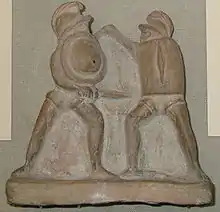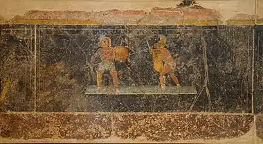 Para reencenar ou parodizar os combates históricos dos romanos contra os gregos, da campanha helénica, era comum para os hoplómacos (gladiadores, por sinal, de trajo heleno) combaterem contra mirmilões (que eram a categoria de gladiador que, por antonomásia, usava o escudo mais semelhante ao das tropas romanas).[14]