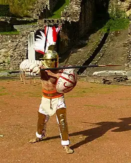 A sobredita armadura pesada era composta por um elmo, uma manica (guarda-braço), ocrea (grevas de cano alto), subligaculum (calções), fasciae, e cingulum (cinto).