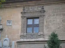 A fachada principal tem quatro janelas platerescas muito ornamentadas, com as iniciais e emblemas dos fundadores e do imperador. No centro abre-se o pórtico, em pedra de Elvira, construída em 1632 e na qual aparecem os símbolos dos Reis Católicos, a canga e o feixe de flechas, uma imagem da Virgem e dos lados as figuras orantes dos Reis Católicos realizadas por Alonso de Mena. No frontão circular há um escudo das armas reais, preso pela águia de São João. Um amplo saguão, de planta retangular e teto de madeira, dá acesso às diversas dependências do edifício.