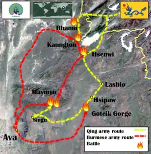 Mas os birmaneses foram pegos de surpresa, em novembro de 1767, quando uma força de 50 mil homens liderada pela elite Manchu Bannermen invadiu novamente. O principal exército chinês derrotou o principal exército birmanês em dezembro de 1767 na batalha de Goteik Gorge, levando a que Hsinbyushin finalmente retirasse os seus exércitos do Sião. O principal exército chinês rompeu as defesas birmanesas e chegou em Singu, cerca de 50 quilômetros ao norte da capital Ava em final de janeiro de 1768. Hsinbyushin como era de seu feitio não se desesperou, e pessoalmente organizou as defesas. Reforçado pelo retorno das tropas do Sião, as forças birmanesas derrotaram o principal exército chinês em março de 1768 na batalha de Maymyo.