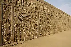 Foram encontradas figuras em relevo, decorando as faces externas da parede norte, sul e oeste da plataforma principal. E na face interna da parede sul da plataforma principal. As figuras se repetem, sofrendo pequenas variações.[4]
