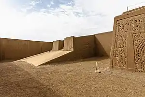 O templo foi construído em forma de L de dois níveis de plataforma. O primeiro nível possui 366 metros quadrados e 3 metros de altura e o segundo nível, considerado o principal, possui 777 metros quadrados e 4,50 metros de altura. A primeira plataforma é acessada por uma rampa, que leva a um pequeno salão. Neste salão há uma rampa que dá acesso a segunda plataforma. Em três lados da segunda plataforma há 14 células alinhadas de tamanhos variados, com a maior célula medindo 4 metros por 2,6 metros e a menor célula medindo 3,6 metros por 2,6 metros. As paredes externas das células são decoradas com figuras em alto relevo. Todo o templo foi construído com adobe, de formato retangular, cornija e trapezoidal. O adobe de formato retangular em sua maioria foi utilizado para a face interior das paredes, e o adode de formato cornija, em grande parte, foi utilizado nas paredes exteriores e no núcleo. A única estrutura construída com pedras em argamassa de barro foi a fundação do pequeno salão da primeira plataforma. Todas as faces internas das paredes que não receberam decoração, foram cobertas com camada de argila de 1 centímetro de espessura.[1][4]