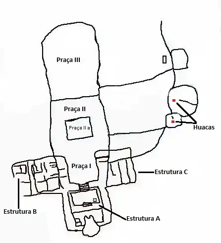 A Estrutura C tem uma base quadrada cujos lados medem 55 metros. Nela encontramos vários recintos retangulares delimitados por muros de 60 cm de largura. No lado oeste da estrutura encontramos um declive suave que vai até o fundo do vale. Os muros periféricos da estrutura de tão deteriorados são quase imperceptíveis. Mas podemos notar que existia um que percorria todo o comprimento da estrutura indo até a Praça II eram também formadas por grandes pedras sem cortes dispostas em fileira dupla e entre ambas as fileiras existiam pequenas pedras unidas com argamassa. [4]