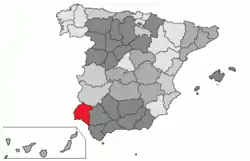 | Fronteiras: | Badajoz (Norte), Sevilha e Cádiz (Leste), Oceano Atlântico (Sul) e Portugal (Oeste). |