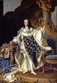 Três retratos sucessivos de Luís XV deixou o Rigaud escova. Muito excepcional em seu contexto, por vezes, em um convencional pose, apesar de já não ampliar seu papel como o rei do reino. Podemos seguir a evolução dos traços do jovem monarca antes de seu amor pela intimidade explodi-lo para retratos mais modestos, mais de acordo com o seu amor de família e salões íntimos. Em setembro de 1715, em seu estúdio, poucos dias após a morte de Luís XIV teve lugar a 01 de setembro daquele ano, Hyacinthe Rigaud termina para desenhar as características do jovem Luís XV, que posou para ele em Versailles pouco antes, a pedido do regente. Por uma ordem escrita datada de 18 de agosto de 1716, o jovem rei indica o prior de Saint-Denis para fornecer o artista os ornamentos reais preservados na abadia, para que você possa completar o retrato no silêncio de seu estudo. O Nouveau Mercure de France junho 1717 ecoa o sucesso deste retrato: "O retrato do rei que o Sr. Rigaud começou em setembro de 1715, que terminou há poucos dias, foi apresentado pelo pintor famoso em 7 de junho de 1717 o Senhor Duke Regent. No dia 10, ele foi levado para a Sua Majestade, que parecia muito feliz em tê-lo em seu gabinete, ele é muito bonito e mostra uma forte semelhança. "Todos os 24 exemplares encomendados pela administração dos edifícios do Rei entre 1716 e 1721, em várias formas , atestam o sucesso dessa pintura, extremamente virtuosa e verdadeiramente comovente de uma criança cuja beleza é universalmente reconhecido.