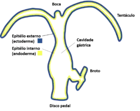 A capacidade impressionante de regeneração em Hydra se deve a sua característica organização corporal formada por duas camadas germinativas, a ectoderme e a endoderme, e pela mesogleia.[8] A ectoderme e a endoderme dão origem aos epitélios externo e interno, respectivamente, e a mesogleia é responsável por formar as linhagens de células nervosas, cnidócitos, células glandulares e gametas.[9] Enquanto que as linhagens celulares da mesogleia são determinadas, os epitélios permanecem em um estado reversível e de contínua produção celular. Portanto, são as células dos epitélios externo e interno que permitem tanto a rápida regeneração de tecido em caso de ferimento quanto a formação completa de um indivíduo a partir de apenas um bloco de células epiteliais extraído de um indivíduo adulto6.