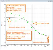 A IC50 é amplamente utilizada em pesquisas farmacológicas para medir o potencial de um antagonista. A IC50 pode ser comparada a outras medidas de potência, como a EC50, utilizada para medir o potencial agonista de uma droga. A EC50 representa a concentração plasmática ou em forma de dosagem suficiente para induzir 50% do efeito máximo de um fármaco em testes in vivo.[1]
