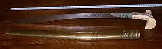 É uma arma branca, corto-perfurante, de dois gumes. A lâmina é côncava perto da empunhadura e convexa perto da ponta, configurando uma espécie de S. O lado côncavo é o lado cortante e o lado convexo é o pontiagudo.[5] A arma denota uma maior robustez na ponta, o que leva a supor que foi ideada para funcionar primeiramente como uma arma de estocada. A lâmina pode estar decorada com gravuras, seja do nome do dono ou com termos evocativos religiosos, como Alá, Maomé ou versos do Alcorão.[6]