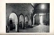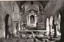 A igreja possui um nártex, seguido de um corpo de três naves, separadas por arcarias de arco em ferradura. Existem vestígios de uma desaparecida iconóstase. O interior é austero e quase não existem pinturas ou imagens.[1].