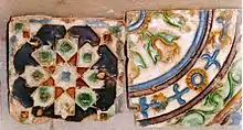 Também a Igreja terá sofrido novas obras em finais do século XV, princípios do século XVI em capelas na zona da cabeceira (Boletim da DGMN). Conhecem-se diversos azulejos de tipo mourisco que terão estado, segundo tudo indica, na antiga capela-mor, que por esta altura sofreu algumas obras. Infelizmente, só numa das obras alusivas aos restauros efectuados no início do século XX se refere, brevemente, a existência de azulejos sem, todavia, os especificar[12]. Sabe-se que o bispo-conde de Coimbra D. Jorge de Almeida, que foi bispo entre 1483 e 1543, mandou efectuar remodelações na Sé de Coimbra com azulejos que encomendou de Sevilha, pela mesma altura[13]. Sendo ele também donatário da Igreja de Lourosa, teriam partido dele estas obras de embelezamento? Chegaram até nós, apesar de tudo, alguns exemplares desses azulejos de tipo mudejar, ou hispano-mourisco, que em boa hora foram salvos durante as referidas obras de recuperação, estando a aguardar, entre outras coisas, espaço num futuro Museu que Lourosa bem mereceria. (Fig. 9 -azulejos)