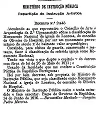 A chamada de atenção sobre Lourosa por estes referidos investigadores levaria à sua classificação como Monumento Nacional por Decreto de 14 de Junho de 1916 (foto 16 decreto), assim como à sua divulgação a estudiosos internacionais, como o Professor Gomez-Moreno que se refere à igreja de Lourosa no seu estudo de 1919 «Iglezias mozárabes…».