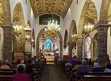 O interior da igreja apresenta 3 naves de cinco tramos, iluminadas por frestas, de arcos quebrados em cantaria regional, com pilares hexagonais de capitéis quadrangulares, sendo os arcos extremos apoiados em mísulas torsas[2]
