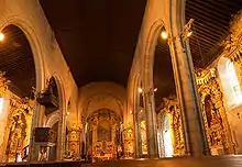 Internamente, a igreja apresenta planta em cruz latina com três naves de diferente altura com cobertura de madeira e cabeceira com três capelas, com uma capela de cada lado do transepto. Os tramos da nave são separados por colunas e arcos de volta perfeita. A capela-mor é coberta por um abóbada com nervuras de feição gótico-manuelina e possui um retábulo barroco de talha dourada, esculpido em 1740 pelo entalhador portuense Manuel Pereira da Costa Noronha. O púlpito e os altares laterais foram esculpidos na primeira metade do século XVIII pelo entalhador João Gomes de Carvalho.