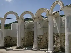 O nártex retangular corresponde à parte central do edifício, entre o átrio e a cela, o qual funciona como ante-câmara da igreja. Encontra-se a leste do átrio, ao qual se acede passando por um portal de grande dimensão e ladeado por dois altos torreões circulares.[16][43][53] Em função da acentuada profundidade deste espaço, Mavrodinov relaciona-o com estruturas similares localizadas em Monte Atos.[26]