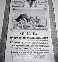 - Um medonho e terrível temporal se desencadeiou na nossa costa, apanhando toda a pescaria da POVOA DE VARZIM no meio do mar, e,' accessando-a ceifou 105 pescadores que a dois passos da terra morreram no meio das vagas encapelladas e cyclopicas. Pede-se às almas boas e generozas que, pelo eterno descanço DAS ALMAS D'ESSES POBRES MARTYRES do trabalho, rezem um PADRE NOSSO E AVE-MARIA para que ellas peça a Deus Nosso Senhor por todas aquellas caritativas pessoas que de tao boa vontade deram suas esmolas para suavizar os horrores da fome e da miseria, a viuvez e a orphandade desprotegida.