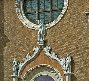 Dos lados estão quatro estátuas dos evangelistas, da escola de Pietro Lombardo; no topo há uma estátua do Redentor, em mármore branco. Os antigos sinos, o maior dos quais de 1424, foram substituídos em 1883.