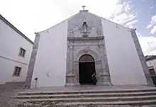 A fachada principal é considerada um dos melhores testemunhos da Renascença portuguesa no Algarve.[2] O pórtico principal, um arco de volta perfeita com ampla decoração all' antico procedente de gravados italianos, sendo encimado pela imagem de Nossa Senhora da Misericórdia; esta imagem, recolhida sob um dossel e ladeada por dois anjos esvoaçantes,[2] encontra-se no meio das figuras de São Pedro e São Paulo, sendo visível ainda o brasão da cidade de Tavira.