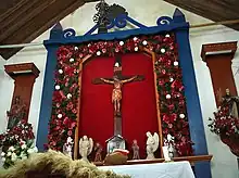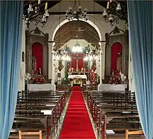 Seu interior era da maior singeleza, embora não desprovido de charme. À esquerda da entrada havia um confessionário neogótico e uma sala guardava belas imagens processionais de roca, uma do Senhor Morto, e outra do Senhor carregando a Cruz. À direita uma escada sobe para o coro de madeira, suportado por colunas também de madeira de capitel coríntio muito simplificado. Um balaústre de madeira de ripas sinuosas completa o conjunto do coro.[6]