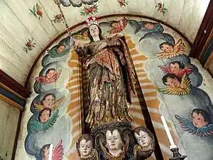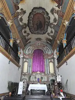 O teto da capela-mor tem uma grande pintura representando Nossa Senhora dos Anjos rodeada de figuras dos Evangelistas. O altar escalonado tem estrutura pintada simulando colunas e detalhes entalhados, com um frontispício coroado pelo emblema franciscano sustentado por dois anjos entalhados.[1] No nicho estão instaladas duas importantes e requintadas estátuas policromadas, em tamanho acima do natural e de feição erudita, uma representando Nossa Senhora dos Anjos, com um cetro na mão direita e apoiada em um pedestal de nuvens e cabeças de querubins, e abaixo dela, um São Francisco de Assis, que segura uma cruz e uma caveira, símbolos do martírio e da penitência, ambas de autoria de Domingos Pinto Coelho. Por trás das imagens, o fundo do nicho tem uma moldura pintada com um resplendor de nuvens, de onde emergem várias cabeças de querubins. No teto do nicho aparece uma representação do Divino Espírito Santo cercado de ramalhetes de rosas.[1][3] Também há uma bela imagem do Senhor Morto, instalada sob a mesa do altar, do mesmo Pinto Coelho.[3]