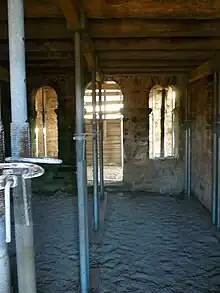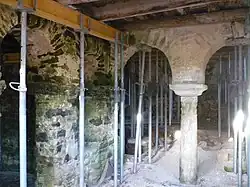 A nave transversal tem, de cada lado, uma arcada dupla em ferradura assente numa coluna com capitel coríntio. As arcadas fariam a comunicação entre a nave transversal e uma zona reservada que faria ligação ao presbitério. Este, atualmente destruído, possuía uma planta rectangular e uma cobertura em abóbada ou de canhão, ou de meia-cúpula. A nave era ladeada por duas ou mais divisões que a acompanhariam longitudinalmente e a que se teria acesso por portas simples.