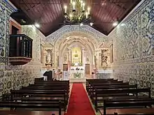 No interior, destacamos a nave com coro-alto revestida de azulejos de padrão, datado de 1681. No lado esquerdo, encontra-se uma porta de entrada para a capela baptismal, de arco de volta perfeita com duas colunas simples. Ao entrarmos nesse espaço podemos observar uma pia baptismal central e um painel de azulejos policromados que representa o Baptismo de Cristo.[4] Nesta mesma parede lateral encontra-se o púlpito, com base de mármore quadrada. Como divisão da nave com a capela-mor observa-se um arco triunfal de volta perfeita do século XVI. Criado por arquivoltas, que assentam em capitéis vegetalistas de bases multifacetadas e intradorso com flores quadrifoliadas. Nessa mesma parede onde se situa o arco, podemos observar dois nichos laterais com frontão triangular e um painel azulejar policromado, com a figura da Nossa Senhora da Conceição. A Capela-mor, de secção rectangular retrata o período manuelino. [5]A cobertura é em abóbada polinervurada de dois tramos assente lateralmente em mísulas e dotada de chaves decoradas com vários medalhões de símbolos vegetalistas e carrancas. As paredes deste espaço são revestidas em azulejos padrão. O altar, datado de 1824 é feito em mármore e possuiu o orago da igreja representado por uma escultura policromada.[2]
